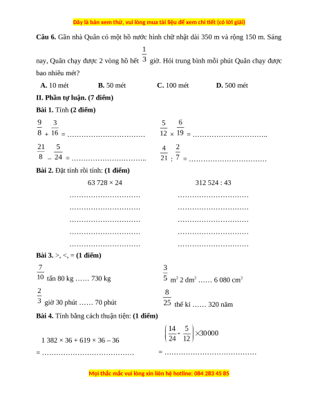 Câu 6. Gần nhà Quân có một hồ nước hình chữ nhật dài 350 m và rộng 150 m. Sáng