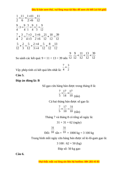 Câu 5. Trong tháng 7, cửa hàng bán được tấn gạo. Số gạo cửa hàng bán được trong tháng 8 bằng