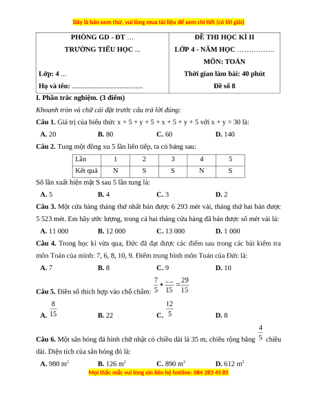Câu 1. Giá trị của biểu thức x + 5 + y + 5 + x + 5 + y + 5 với x + y = 30 là: A. 20 B. 80 C. 60 D. 140
