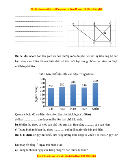 bạn vùng cao. Biểu đồ sau biểu diễn số tiền mỗi bạn trong nhóm học sinh có được nhờ bản phế liệu. Tiền bán phế li u ệ c a ủ các b n ạ trong nhóm 350 300 300 280 250 230 250 240 ng) ồ 200 150 100 (nghìn đ 50 0 Vân Hoa Nam Huy Quân