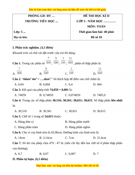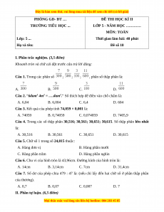 Đề thi cuối kì 2 Toán lớp 5 năm 2023 (Đề 10)