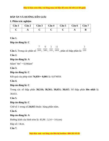 I. Phần trắc nghiệm Câu 1 Câu 2 Câu 3 Câu 4 Câu 5 Câu 6 Câu 7 C A C C C A B Câu 1. Đáp án đúng là: C