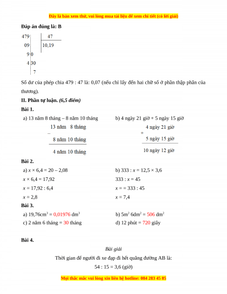 b) 333 : x = 12,5 × 3,6 x × 6,4 = 17,92 333 : x = 45 x = 17,92 : 6,4 x = = 333 : 45 x = 2,8 x = 7,4 Bài 3. a) 19,76cm3 = 0,01976 dm3 b) 5m2 6dm2 = 506 dm2 c) 2 năm 6 tháng = 30 tháng d) 12 phút = 720 giây Bài 4. Bài giải