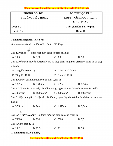Đề thi cuối kì 2 Toán lớp 5 năm 2023 (Đề 11)