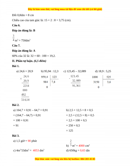 II. Phần tự luận. (6,5 điểm) Bài 1. a) 24,6 × 20,9 b) 95,94 : 12,3 c) 123,45 – 32,089 d) 18,9 : 5,25 Bài 2.