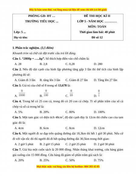 Đề thi cuối kì 2 Toán lớp 5 năm 2023 (Đề 12)