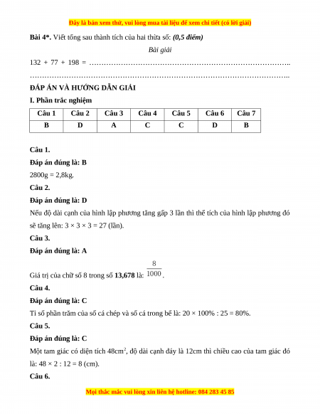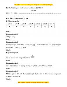 I. Phần trắc nghiệm Câu 1 Câu 2 Câu 3 Câu 4 Câu 5 Câu 6 Câu 7 B D A C C D B Câu 1. Đáp án đúng là: B 2800g = 2,8kg. Câu 2. Đáp án đúng là: D