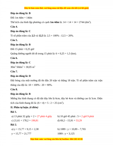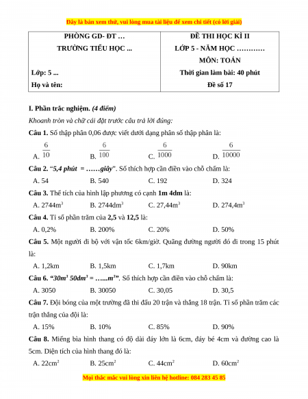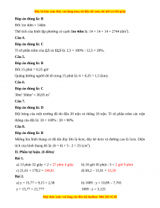 Quãng đường người đó đi trong 15 phút là: 6 × 0,25 = 1,5 (km). Câu 6. Đáp án đúng là: C 30m3 50dm3 = 30,05 m3 Câu 7. Đáp án đúng là: D