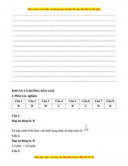 Số thập phân 0,06 được viết dưới dạng phân số thập phân là: Câu 2. Đáp án đúng là: D 5,4 phút = 324 giây Câu 3.