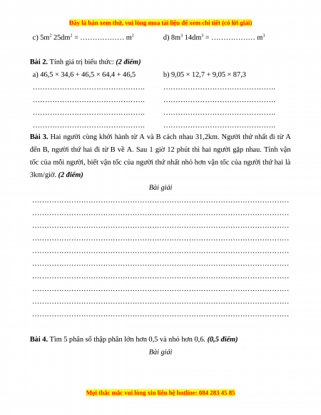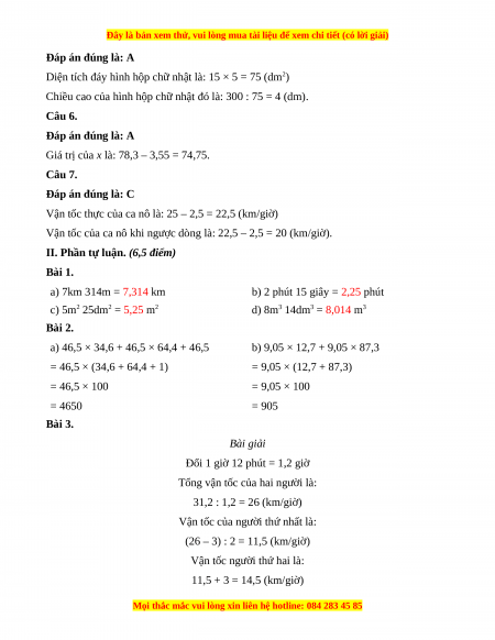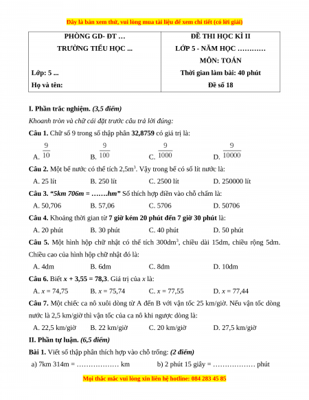 Đề thi cuối kì 2 Toán lớp 5 năm 2023 (Đề 18)
