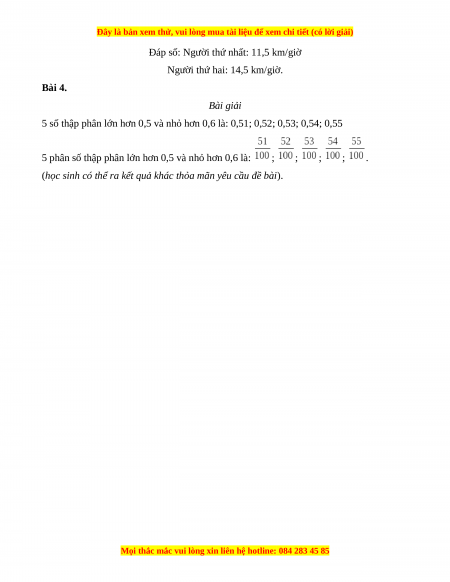 Bài 4. Tìm 5 phân số thập phân lớn hơn 0,5 và nhỏ hơn 0,6. (0,5 điểm) Bài giải