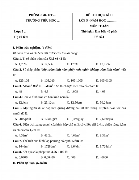 Đề thi cuối kì 2 Toán lớp 5 năm 2023 (Đề 4)