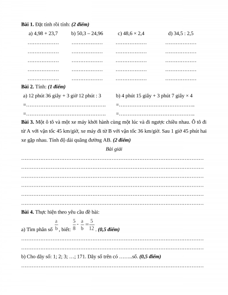 Bài 1. Đặt tính rồi tính: (2 điểm) a) 4,98 + 23,7 b) 50,3 – 24,96 c) 48,6 × 2,4 d) 34,5 : 2,5 ……………… ……………… ……………… ……………… ……………… ……………… ……………… ……………… ……………… ……………… ……………… ……………… ……………… ……………… ……………… ……………… ……………… ……………… ……………… ………………