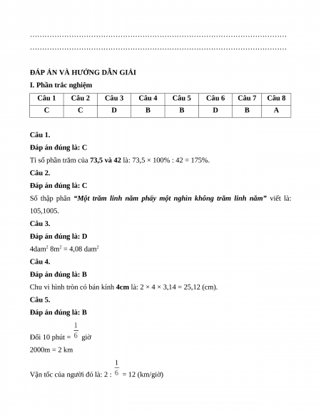 Vận tốc của người đó là: 2 : = 12 (km/giờ) Câu 6. Đáp án đúng là: D