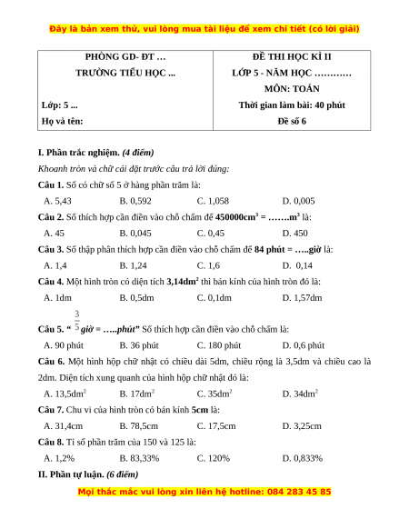 Số có chữ số 5 ở hàng phần trăm là: 1,058 Câu 2. Đáp án đúng là: C 450000cm3 = 0,45m3 Câu 3. Đáp án đúng là: A 84 phút = giờ = 1,4 giờ. Câu 4. Đáp án đúng là: A