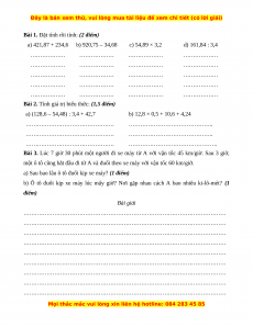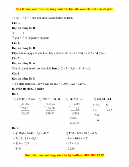 II. Phần tự luận. (6 điểm) Bài 1. a) 421,87 + 234,6 b) 920,75 – 34,68 c) 54,89 × 3,2 d) 161,84 : 3,4 Bài 2.