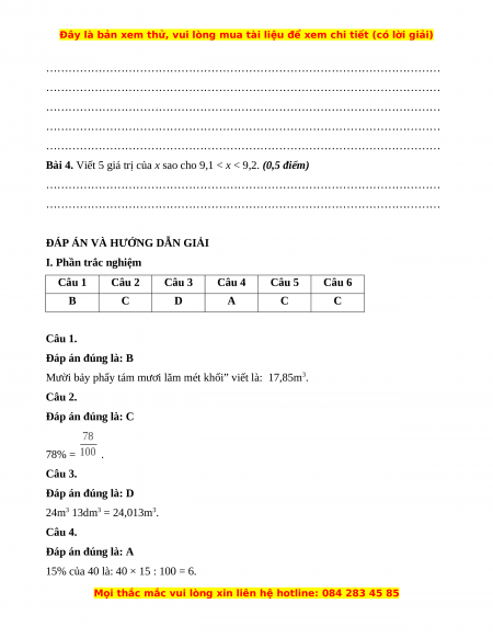 Mười bảy phẩy tám mươi lăm mét khối” viết là: 17,85m3. Câu 2. Đáp án đúng là: C 78% = . Câu 3. Đáp án đúng là: D 24m3 13dm3 = 24,013m3. Câu 4. Đáp án đúng là: A