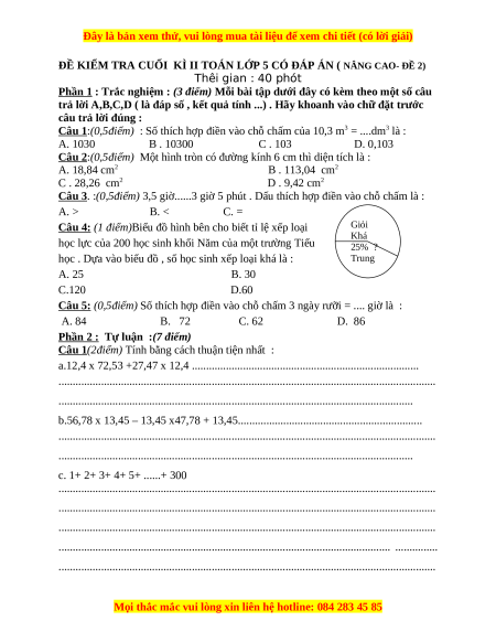 ĐỀ KIỂM TRA CUỐI KÌ II TOÁN LỚP 5 (NÂNG CAO- ĐỀ 2)