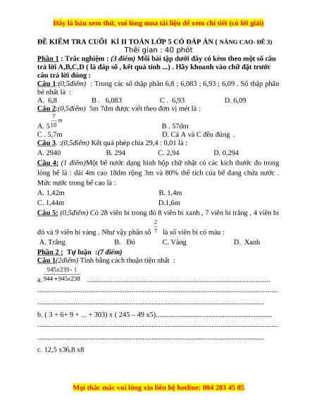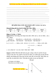 ĐỀ KIỂM TRA CUỐI KÌ II TOÁN LỚP 5 (NÂNG CAO- ĐỀ 3) ĐÁP ÁN