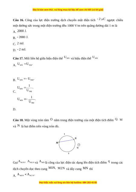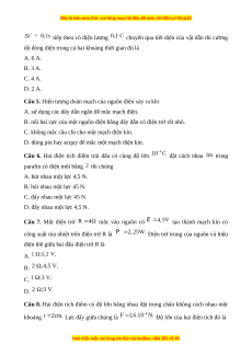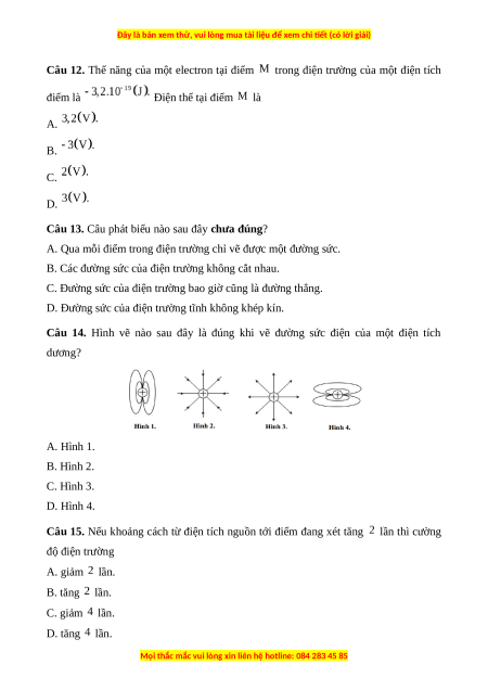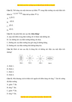 Câu 15. Nếu khoảng cách từ điện tích nguồn tới điểm đang xét tăng lần thì cường độ điện trường A. giảm lần. B. tăng lần. C. giảm lần. D. tăng lần.