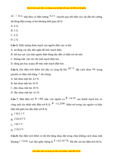 dộ dòng điện trong cả hai khoảng thời gian đó là A. 6 A. B. 3 A. C. 4 A. D. 2 A.