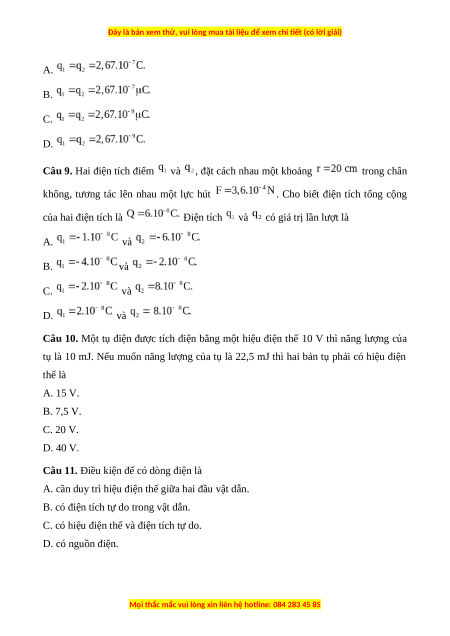 Câu 8. Hai điện tích điểm có độ lớn bằng nhau đặt trong chân không cách nhau một khoảng