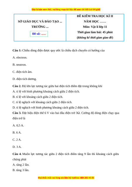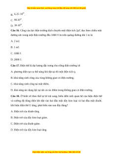 Câu 4. Muốn lực tương tác giữa 2 điện tích điểm tăng 9 lần thì khoảng cách giữa chúng phải A. tăng 2 lần. B. tăng 3 lần.