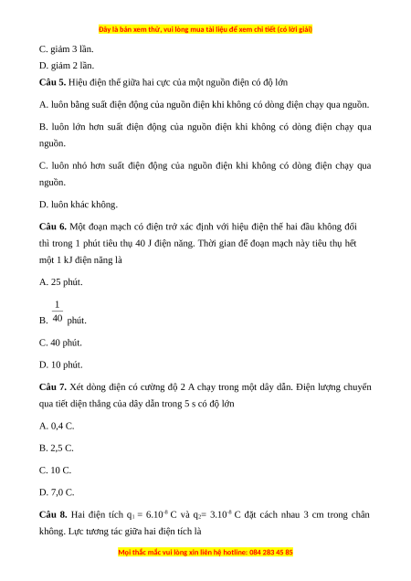 Câu 5. Hiệu điện thế giữa hai cực của một nguồn điện có độ lớn