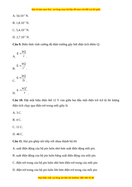 Câu 9. Biểu thức tính cường độ điện trường gây bởi điện tích điểm Q: A. . B. . C. . D. .