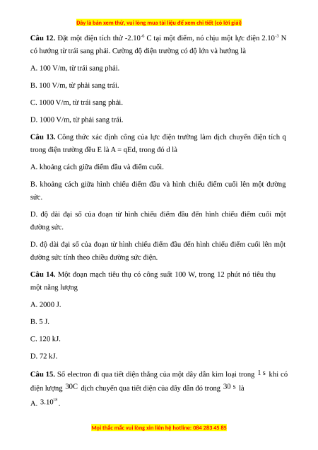 Câu 12. Đặt một điện tích thử -2.10-6 C tại một điểm, nó chịu một lực điện 2.10-3 N