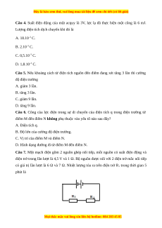 Câu 5. Nếu khoảng cách từ điện tích nguồn đến điểm đang xét tăng 3 lần thì cường độ điện trường A. giảm 3 lần. B. tăng 3 lần. C. giảm 9 lần. D. tăng 9 lần.