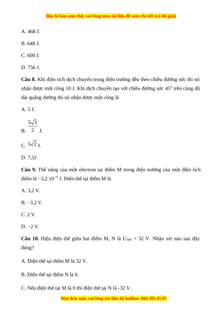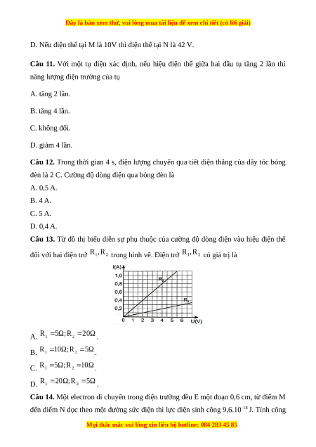Câu 10. Hiệu điện thế giữa hai điểm M, N là UMN = 32 V. Nhận xét nào sau đây đúng?