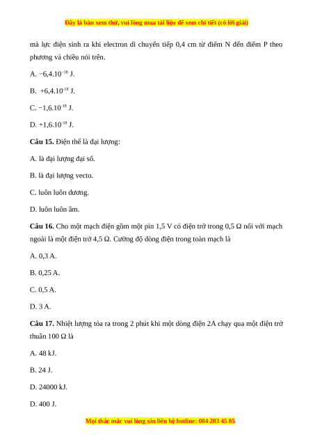 Câu 14. Một electron di chuyển trong điện trường đều E một đoạn 0,6 cm, từ điểm M