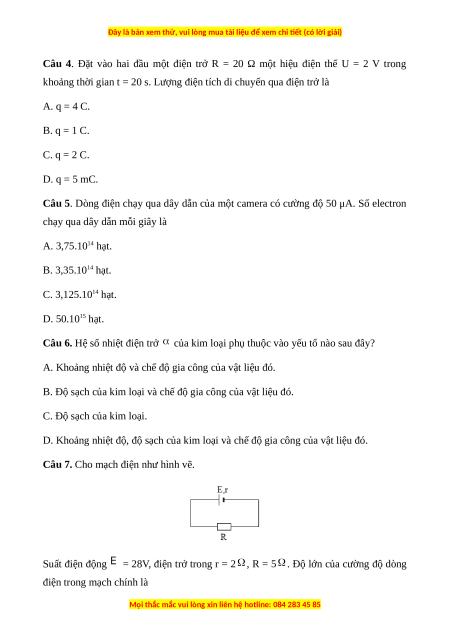 Câu 6. Hệ số nhiệt điện trở của kim loại phụ thuộc vào yếu tố nào sau đây?