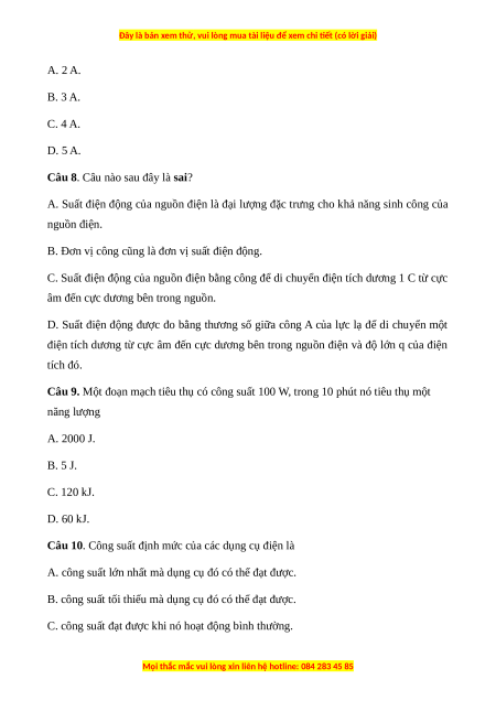 Câu 9. Một đoạn mạch tiêu thụ có công suất 100 W, trong 10 phút nó tiêu thụ một năng lượng A. 2000 J. B. 5 J. C. 120 kJ. D. 60 kJ.