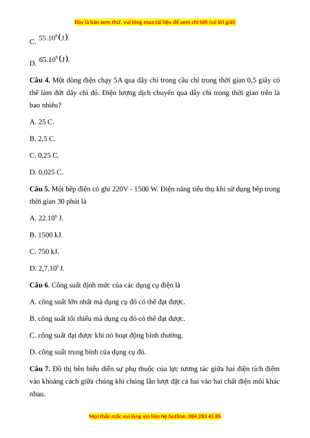 Câu 4. Một dòng điện chạy 5A qua dây chì trong cầu chì trong thời gian 0,5 giây có
