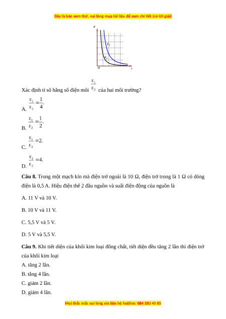 Câu 9. Khi tiết diện của khối kim loại đồng chất, tiết diện đều tăng 2 lần thì điện trở của khối kim loại A. tăng 2 lần. B. tăng 4 lần. C. giảm 2 lần. D. giảm 4 lần.