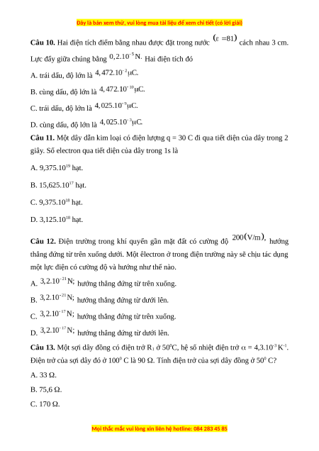 Câu 10. Hai điện tích điểm bằng nhau được đặt trong nước cách nhau 3 cm.