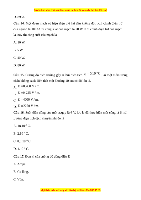 Câu 13. Một sợi dây đồng có điện trở R1 ở 500C, hệ số nhiệt điện trở = 4,3.10-3 K-1.