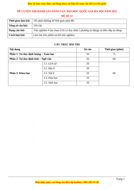 ĐỀ LUYỆN THI ĐÁNH GIÁ NĂNG LỰC ĐẠI HỌC QUỐC GIA HÀ NỘI NĂM 2022 ĐỀ SỐ 11 Thời gian làm bài: