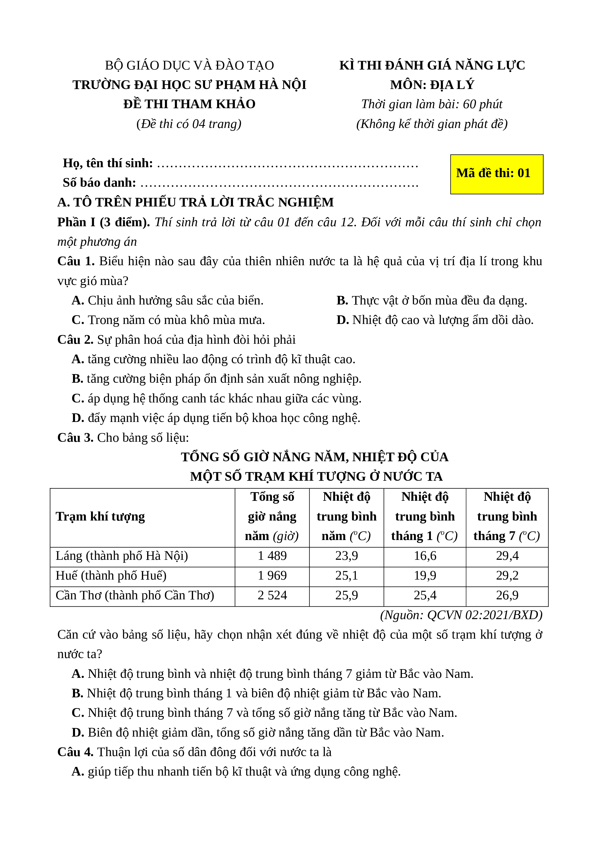 TRƯỜNG ĐẠI HỌC SƯ PHẠM HÀ NỘI MÔN: ĐỊA LÝ ĐỀ THI THAM KHẢO