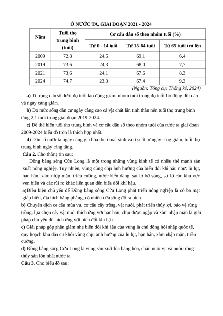 Từ 65 tuổi trở lên 2009 72,8 24,5 69,1 6,4 2019 73 6 24,3 68,0 7,7 2021 73,6 24,1 67,6 8,3 2024 74,7 23,3 67,4 9,3