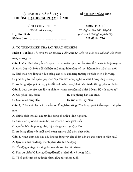TRƯỜNG ĐẠI HỌC SƯ PHẠM HÀ NỘI ĐỀ THI CHÍNH THỨC MÔN: ĐỊA LÍ (Đề thi có 4 trang)