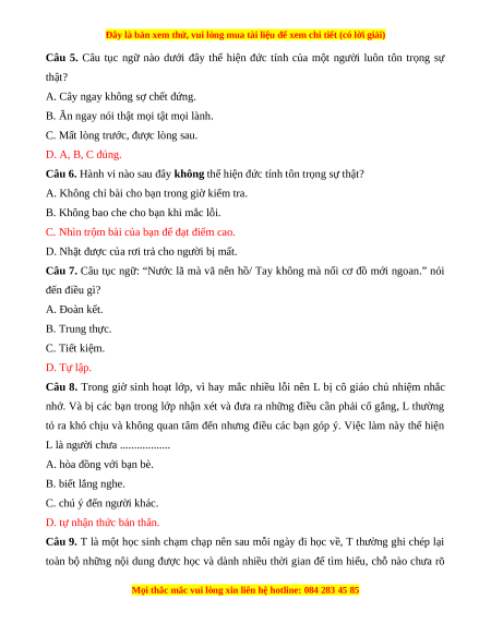 Câu 5. Câu tục ngữ nào dưới đây thể hiện đức tính của một người luôn tôn trọng sự thật?
