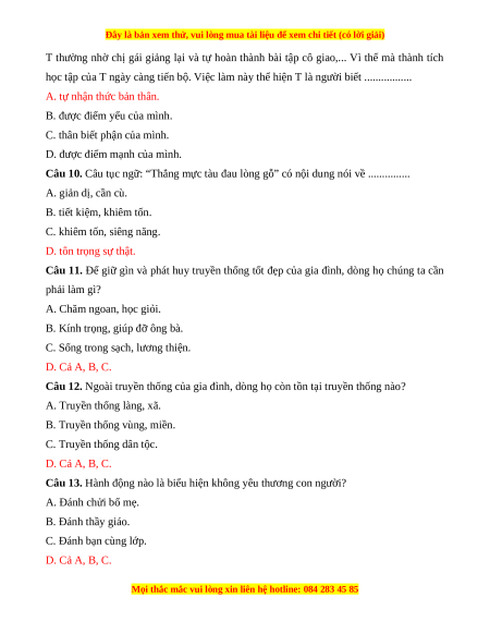 Câu 11. Để giữ gìn và phát huy truyền thống tốt đẹp của gia đình, dòng họ chúng ta cần phải làm gì? A. Chăm ngoan, học giỏi.