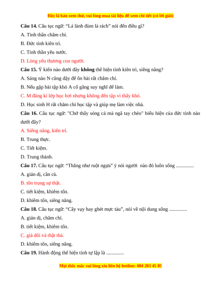 Câu 16. Câu tục ngữ: "Chớ thấy sóng cả mà ngã tay chèo" biểu hiện của đức tính nào dưới đây? A. Siêng năng, kiên trì. B. Trung thực. C. Tiết kiệm. D. Trung thành.