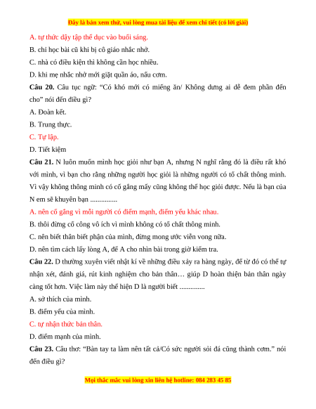 Câu 7. Câu tục ngữ: “Nước lã mà vã nên hồ/ Tay không mà nổi cơ đồ mới ngoan.” nói đến điều gì? A. Đoàn kết. B. Trung thực. C. Tiết kiệm. D. Tự lập.