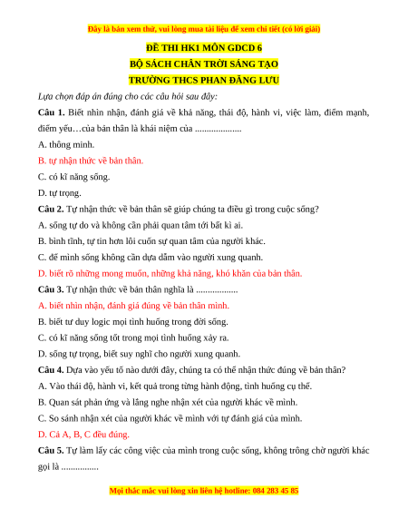 Đề thi GDCD 6 cuối kì 1 THCS Phan Đăng Lưu - Đề 9 có đáp án