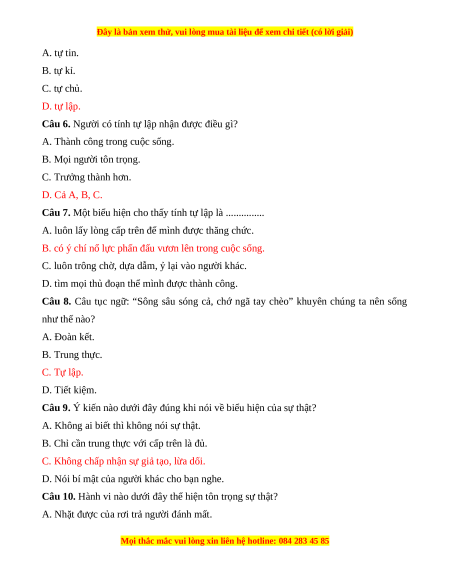 Câu 8. Câu tục ngữ: “Sông sâu sóng cả, chớ ngã tay chèo” khuyên chúng ta nên sống như thế nào? A. Đoàn kết. B. Trung thực. C. Tự lập. D. Tiết kiệm.