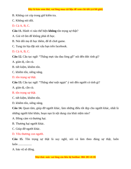 Câu 15. Tôn trọng sự thật là suy nghĩ, nói và làm theo đúng sự thật, luôn